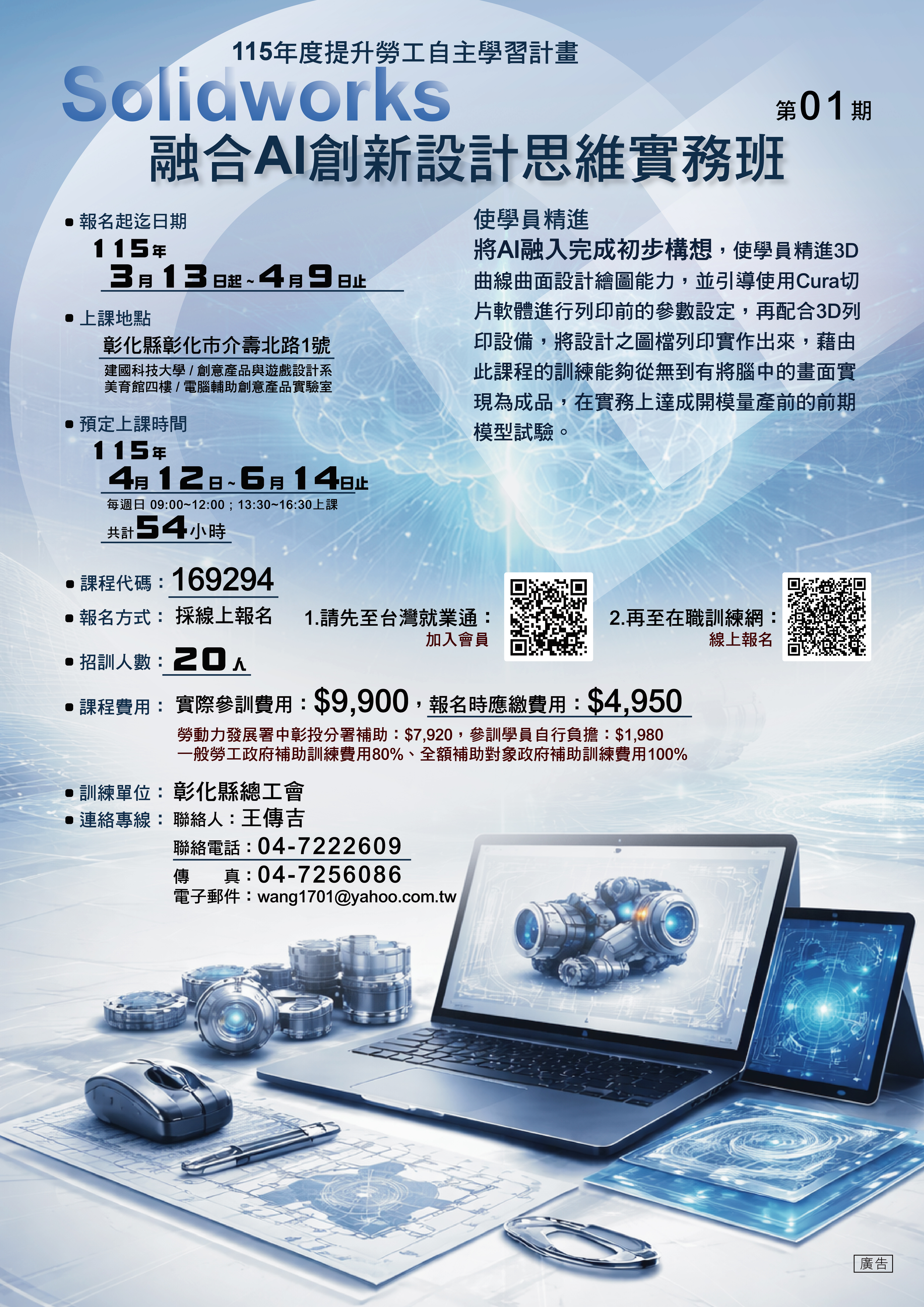 【招生中】彰化縣總工會-SolidWorks融合AI創新設計思維實務班第01期