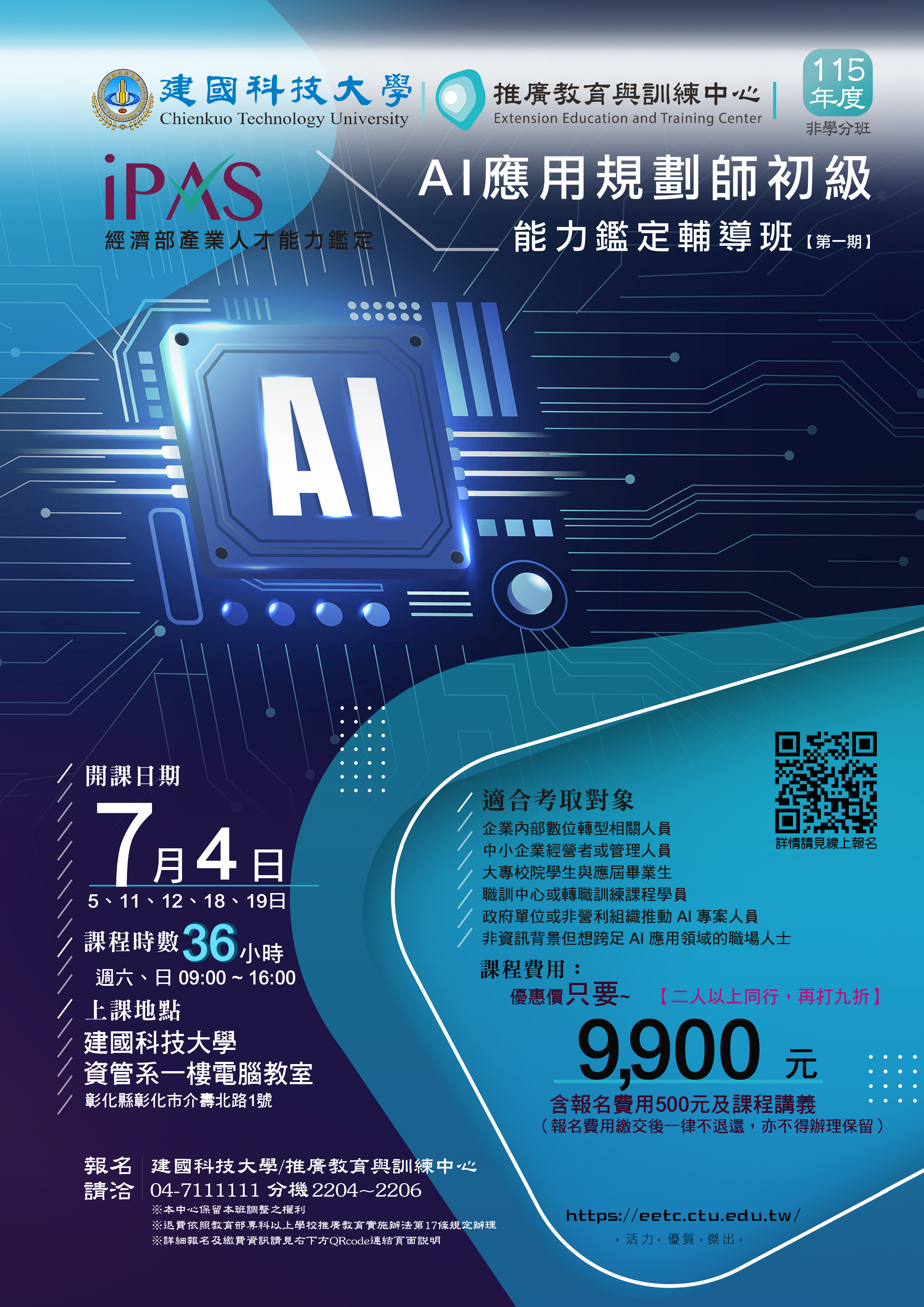 上課日期:115/7/4、7/5、7/11、7/12、7/18、7/19(每周六、日) 上課時間:9:00~16:00 課程時數:36小時 課程費用:優惠價只要~9,900元(二人以上同行,再打九折)【含報名費用500元及課程講義(報名費用繳交後一律不退還,亦不得辦理保留)】 上課地點:建國科技大學/資管系一樓電腦教室(彰化市介壽北路1號) 請用手機報名請用手機報名