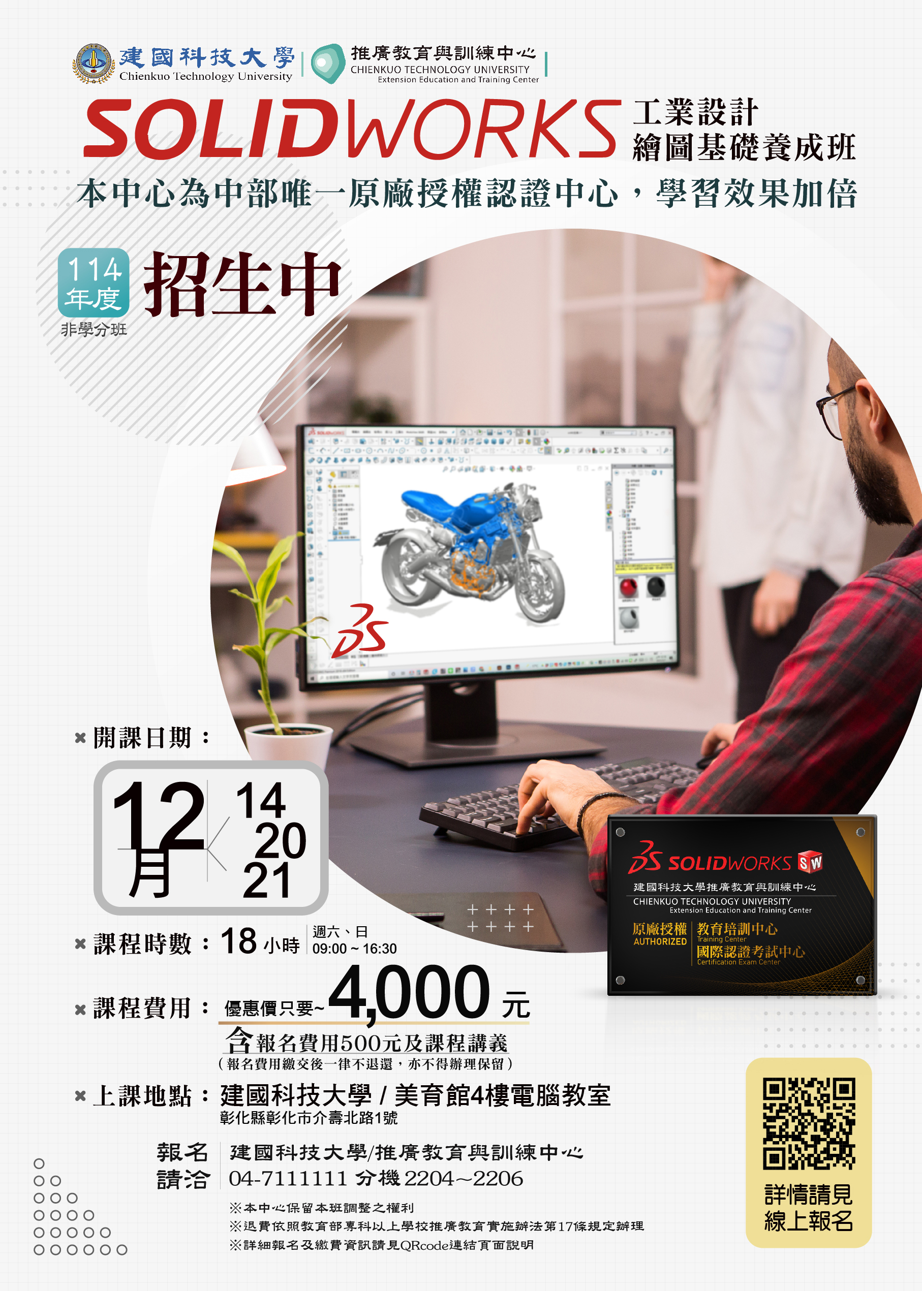 上課時數:18小時 上課日期:12/14、12/20、12/21(每周六、日) 上課時間:9:00~16:30 課程費用:優惠價只要4,000元(含報名費用500元及課程講義) 上課地點:建國科技大學/美育館4樓電腦教室(彰化市介壽北路1號) 課程大綱: 單元一:基礎介紹、草圖及參考平面 單元二:伸長填料及伸長除料 單元三:旋轉填料及旋轉除料 單元四:掃出填料及掃出除料 單元五:疊層拉伸填料及疊層拉伸除料 單元六:旋轉與複製